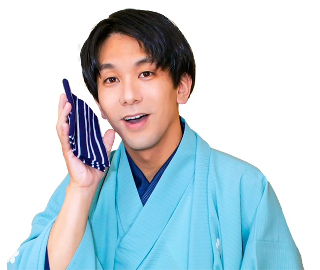 落語は会話のみで構成され、シチュエーションも会話のみで表現します。また、手拭と扇子のみであらゆるものを表現することも大きな特徴です。